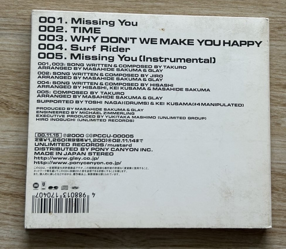 1 Missing You 5:50 2 Time 3:59 3 Why Don’t We Make You Happy 3:02 4 Surf Rider 3:49 5 Missing You (Instrumental) 5:48